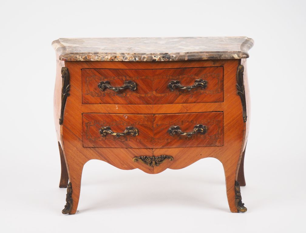 Meuble de maitrise figurant une commode sauteuse de style Louis XV en marqueterie ouvrant à 2 tiroirs, dessus marbre. Dim. 23 x 30 x 15,5 cm.