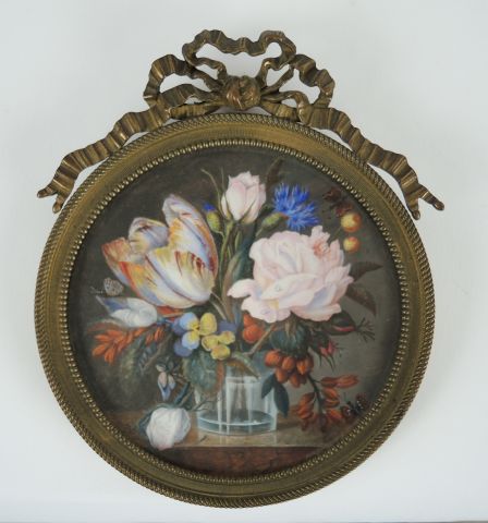 Miniature de style Louis XVI ‘bouquet de fleurs dans un vase sur un entablement’. Cadre médaillon en bronze. Diam. 10 cm