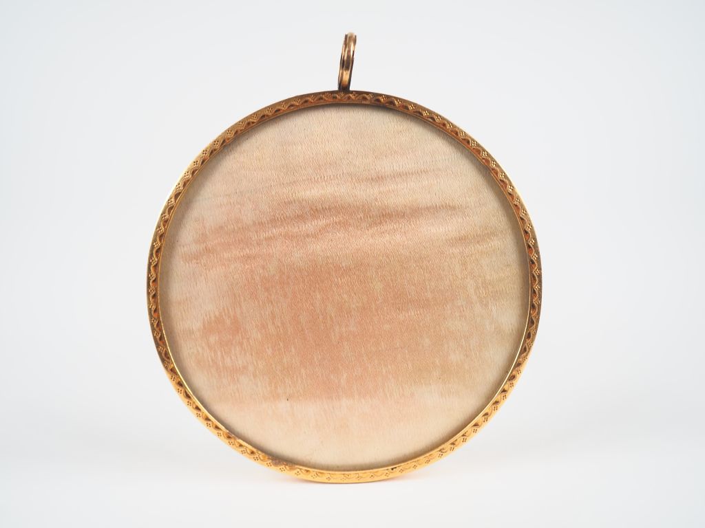 Miniature Directoire "portrait d'homme au jabot", cadre en or, anneau en métal doré. Diam. 5,7 cm
