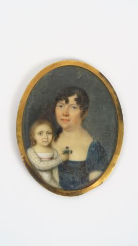 Miniature en médaillon fin XVIIIème début XIXème 'portrait de jeune mère et de sa fille'. 7,5 x 5,5 cm