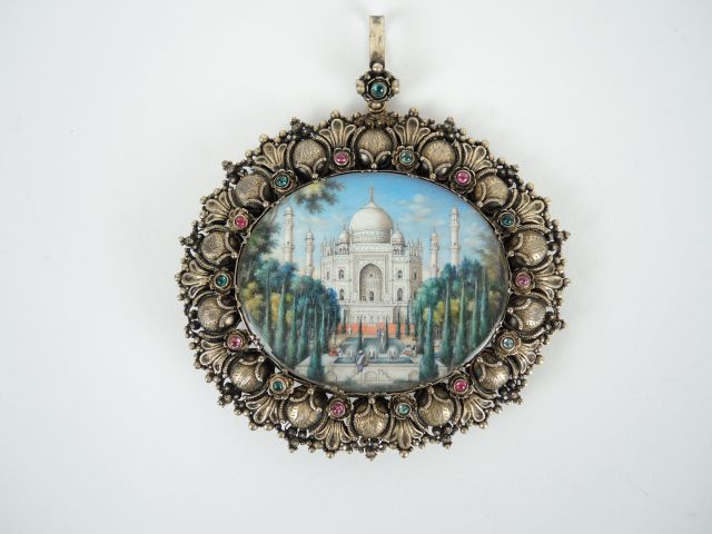 Miniature indienne fin XIXème début XXème ‘vue du Taj Mahal’. Dans son cadre d’origine en argent doré rehaussé de pierres de couleurs. Dimensions de la miniature : 6 x 5 cm. Dimensions du cadre : 8 x 9 cm