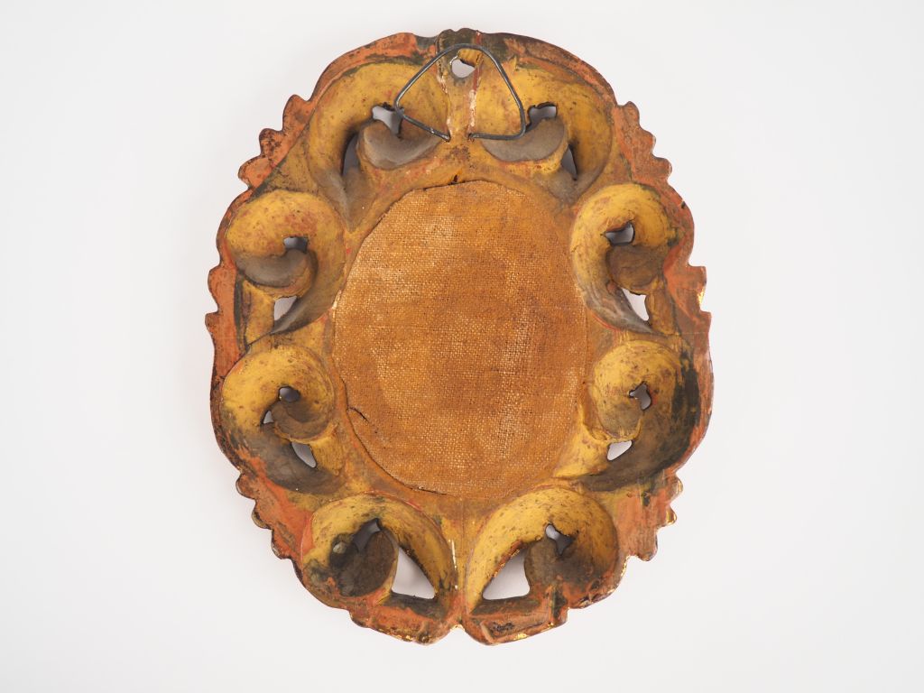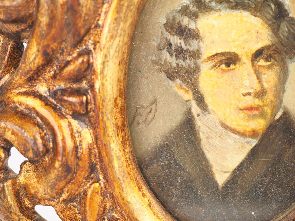 Miniature XIXème "portrait d'homme". Aquarelle monogrammée FD dans son cadre en bois doré ajouré. Dim. (huile) : 7,5 x 5 cm. Dim. (totale) : 18 x 15 cm.