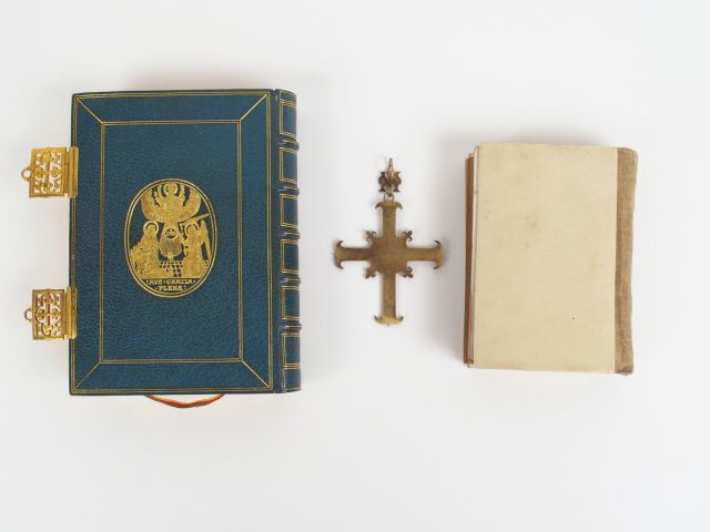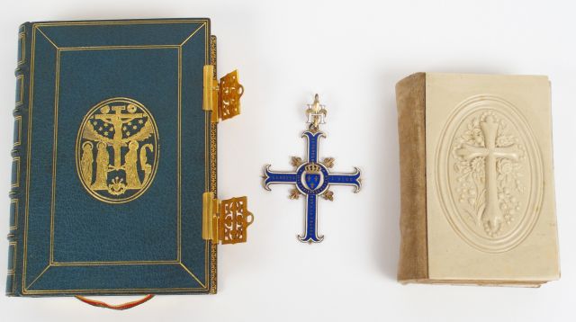 Missel XIXème en ivoire et velours de soie, Missel XIXème en maroquin bleu et or, Médaille en vermeil, et émail 'Dieu protège la France'