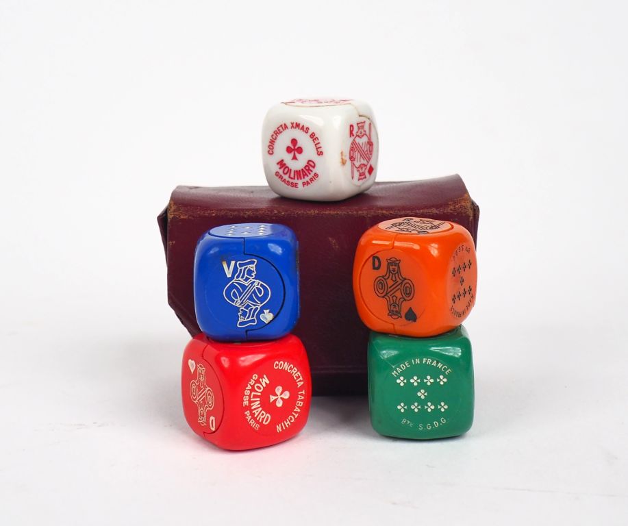 Lot de MOLINARD. Suite de 6 dés parfumés dans leur étui en cuir, signé. Dim. au prix de 40 à 60 € en vente aux enchères par l'hôtel des ventes Primardeco