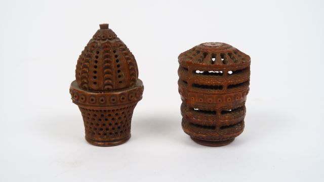 Œuf à chapelet en corozo sculpté en forme de panier, Œuf à chapelet en corozo à décor de motifs circulaires ajourés (petits accidents) ,
