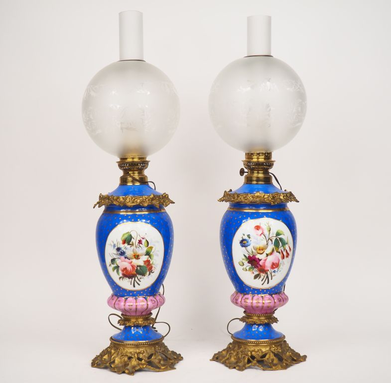 Paire de lampes à pétrole Napoléon III en porcelaine polychrome à décor dans des réserves d'amours musiciens et de bouquet de fleurs polychromes sur fond bleu et rose rehaussé d'or , avec leurs globes gravés. H. 62 cm