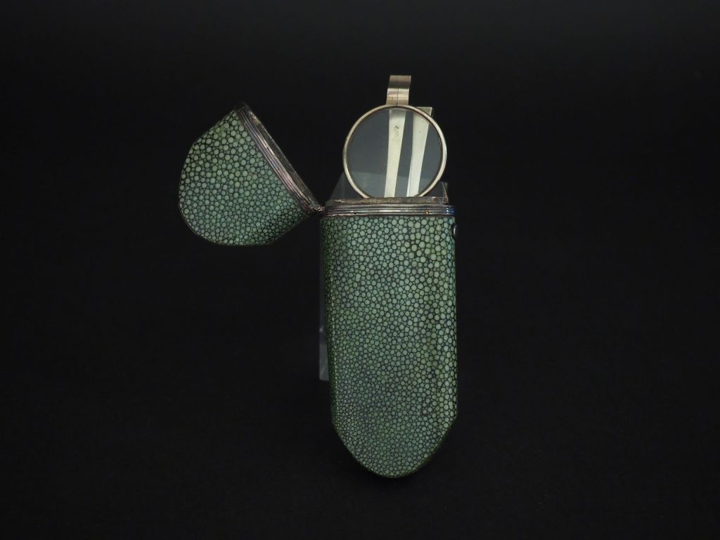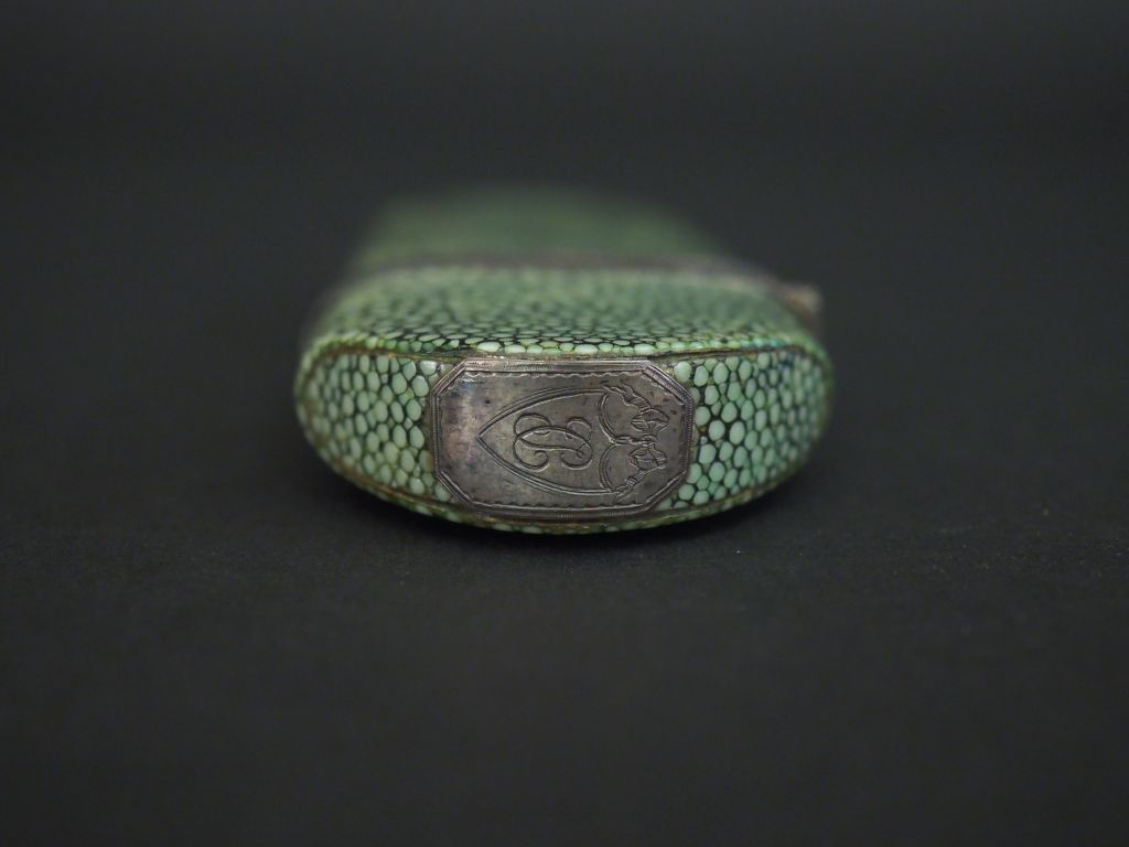 Paire de lunettes XIXème en verre et argent à branches pliables, dans son étui en galuchat vert à décor de cartouche monogrammé. Dim. 13,5 x 5 cm.