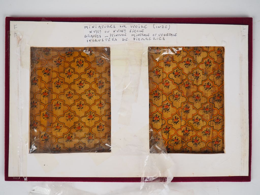 Paire de miniatures sur ivoire indiennes, représentant deux dignitaires dans leur palais. Dim : 41,5 x 11,2 cm.