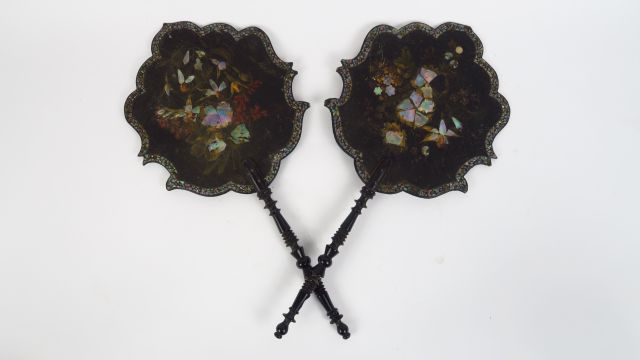 Paire de petits écrans de chaleur Napoléon III en bois noirci et marqueterie de nacre (petits manques)