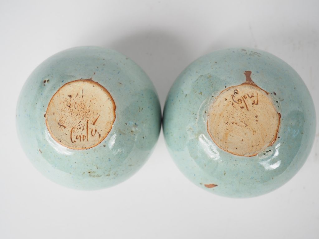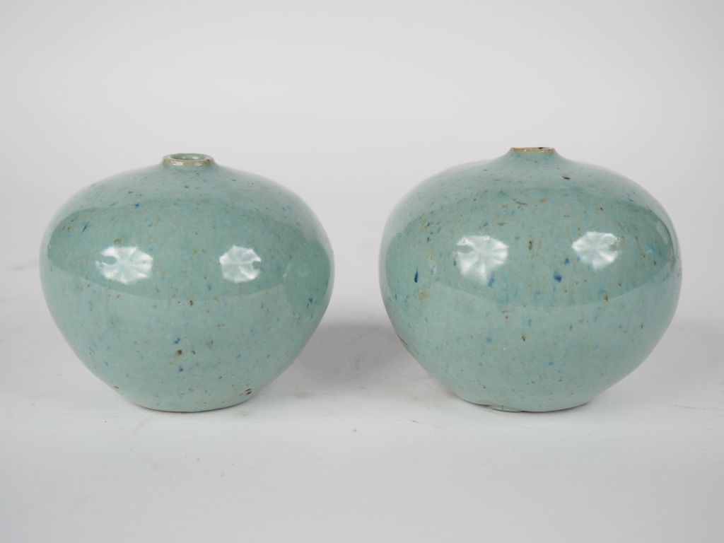 Paire de soliflores de forme boule en grès moucheté bleu ciel. H. 8 c...