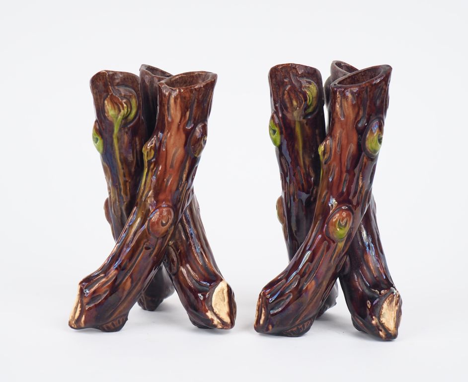 Paire de vases 1900 en barbotine polychrome figurant des branches d'arbes. H. 18 cm. (Petites égrenures).