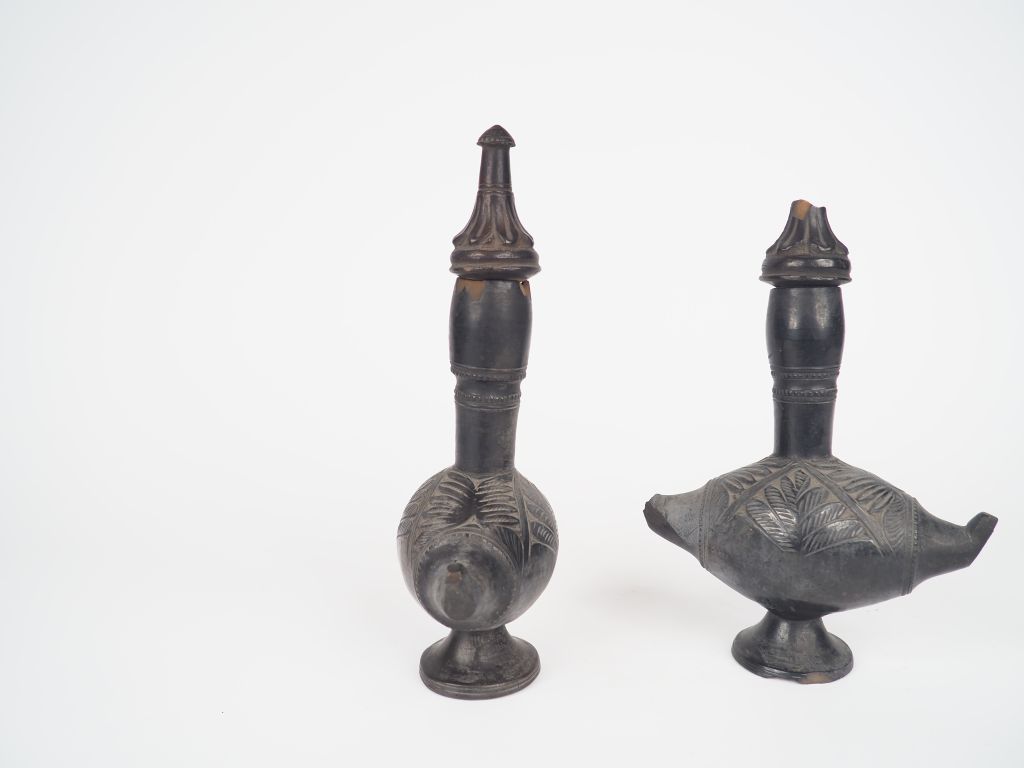 Paire de vases couverts en terre cuite patinée à décor feuillagé. Dim. 23,5 x 15 x 8 cm.