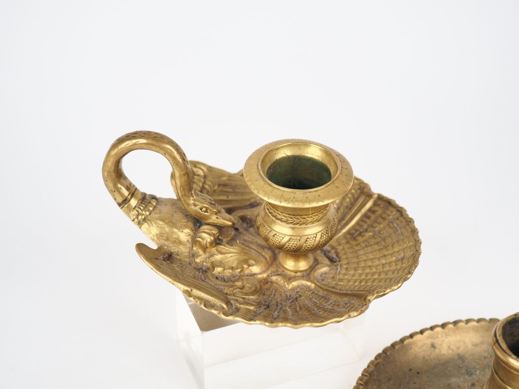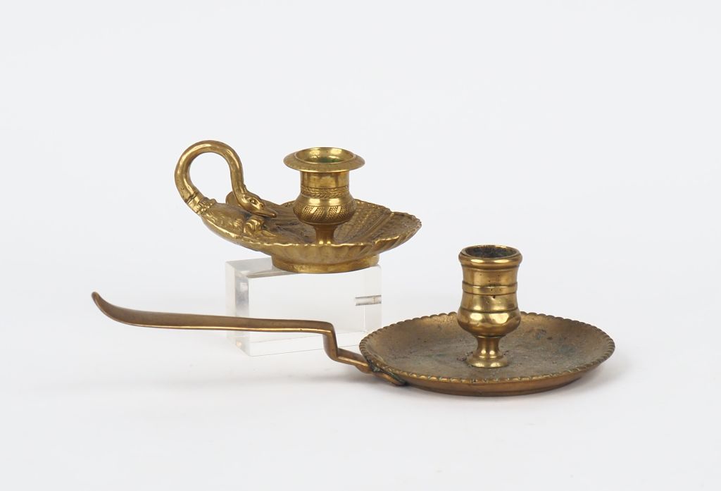Passe-couloir XVIIème en bronze. Marqué "D" sous la base. Dim. 5,5 x 25,5 x 12,5 cm. On y joint un passe-couloir Napoléon III à décor en forme de coquille, prise en forme de cygne. Dim. 6 x 13,5 x 11 cm.
