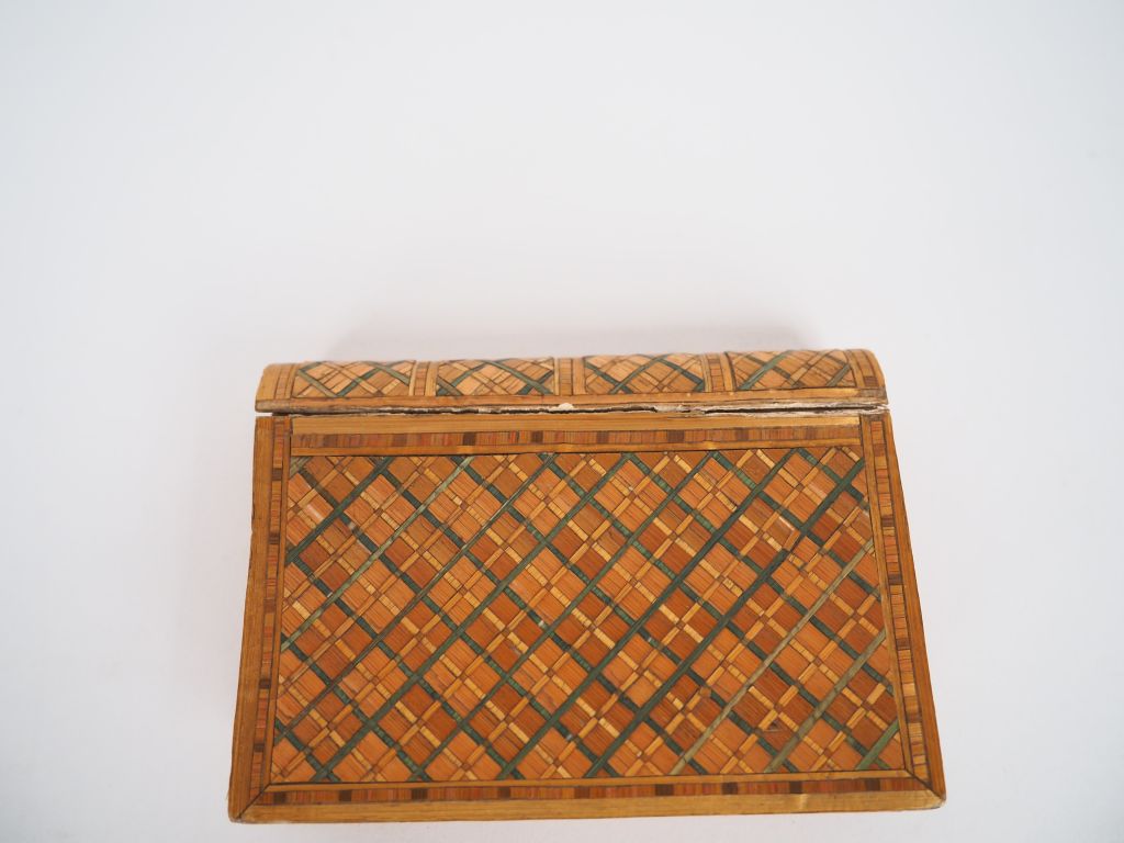 Petite boîte à couture en marqueterie de paille en forme de livres, intérieur découvrant un miroir et une gravure légendée "assurée de votre coeur, je ne veux d'autre bonheur". Dim. 8,5 x 6 cm.