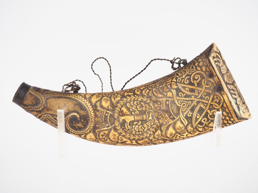 Poire à poudre XIXème de style Renaissance en os ou corne sculpté à décor de tête d'éléphant, de sanglier, d'animaux et de végétaux. Dim. 28 x 10 cm.