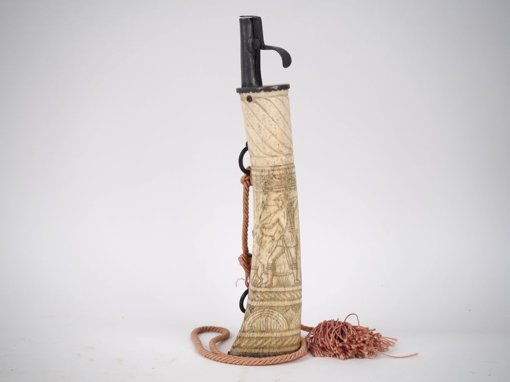 Poire à poudre XIXème en os gravée et sculptée à décor d'un scène de chasse et d'armoiries. H. 31 cm.