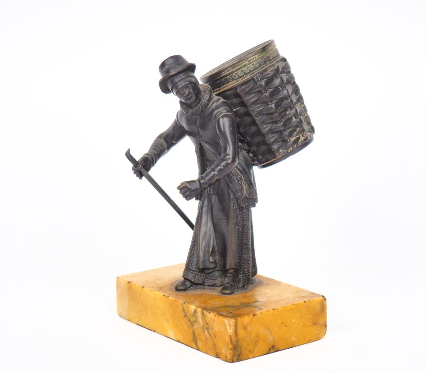 Porte allumettes XIXème en forme de colporteur chapeauté, socle marbre jaune de Sienne H. avec le socle : 14 cm