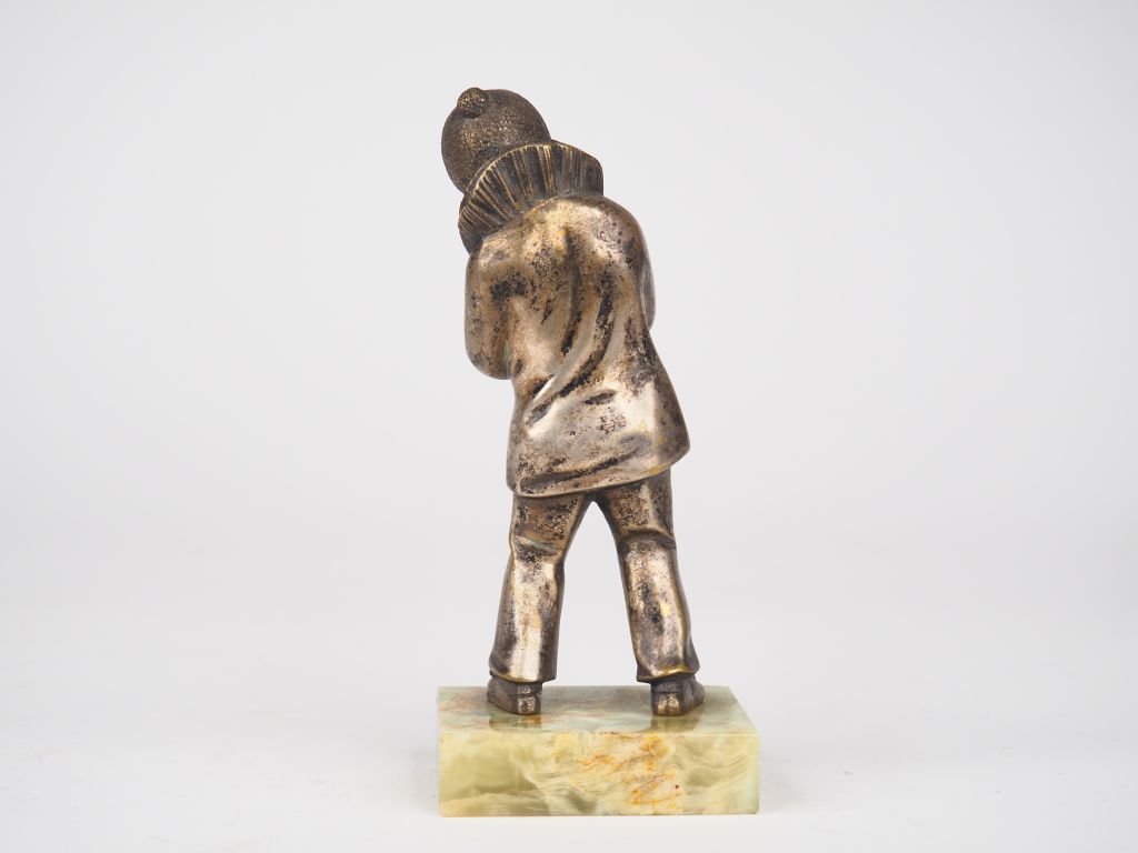 Sujet Art Déco en bronze argenté et ivoire "Pierrot", socle en onyx vert. Dim. 16,5 x 7 x 5,7 cm. (accident à l'oreille gauche et au nez).