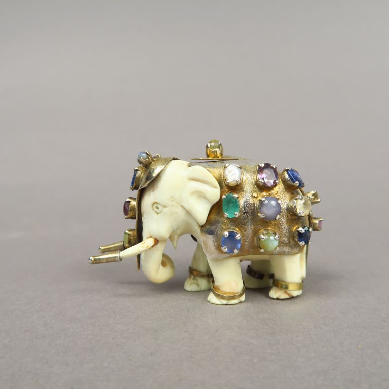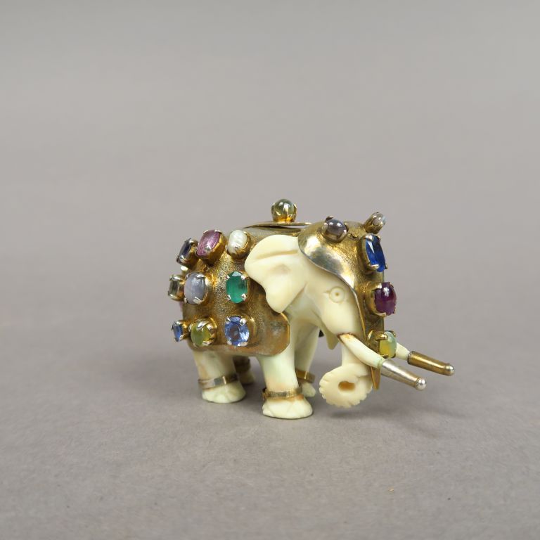 Sujet exotique "éléphant" carapaçonné en ivoire, métal et pierres de couleur. H. : 4,5 cm.