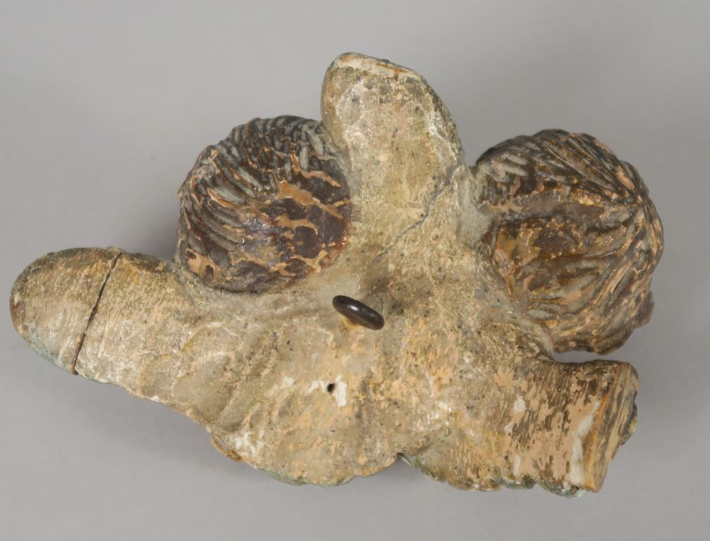 Sujet XVIIIème en bois sculpté et polychrome "Deux angelots". Les yeux en verre. 9 x 14,5 cm (manques et accidents)