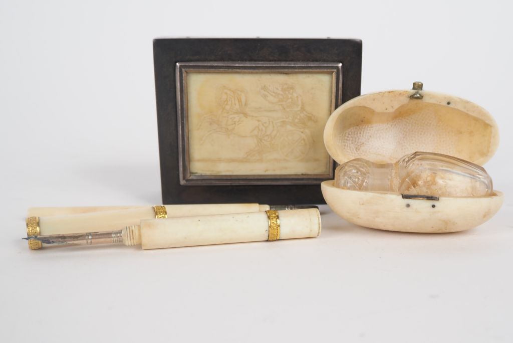 Tabatière XIXème en écaille à décor d'une plaque d'ivoire gravée à l'effigie d'un char à l'antique. Dim. 3,5 x 7 x 6 cm. Certificat CITES en cours. On y joint un étui à sels avec son flacon en verre, un porte-mine et une plume, l'ensemble en ivoire XIXème. Poids total. 144 g Certificat CITES en cours.