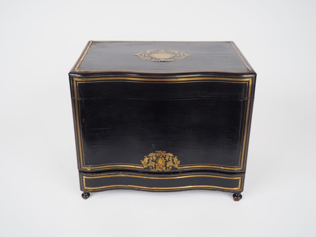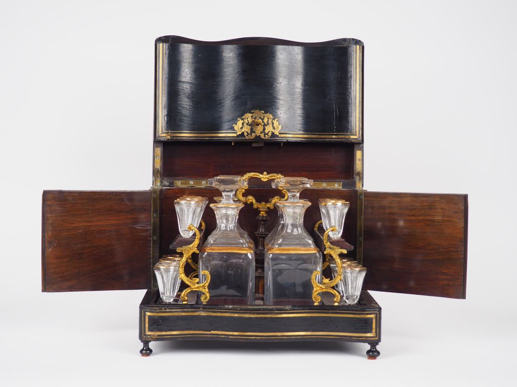 TAHAN à Paris. Cave à liqueur en marqueterie Boulle, placage d'ébène et laiton. Comprenant: - 4 flacons - 16 verres à liqueur. L'ensemble en verre à décor de filets dorés. Signée. (Accidents).