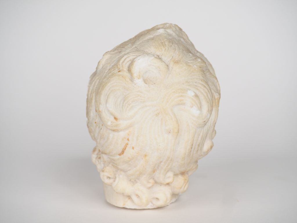 Tête début Xxème dans le goût de l'antique en marbre reconstitué. H. 14 cm. (Accidents). Expert : Jean-Sylvain Caillou, EI.