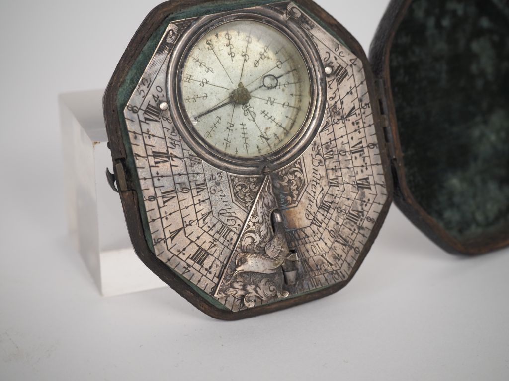 Boussole Butterfly XVIIIème en argent verre et métal, ornée d'une colombe en relief, dans son étui en cuir et velours vert. Signée BUTTERFIELD à Paris. Dim. 6,5 x 6 cm. Poids brut 35 g.