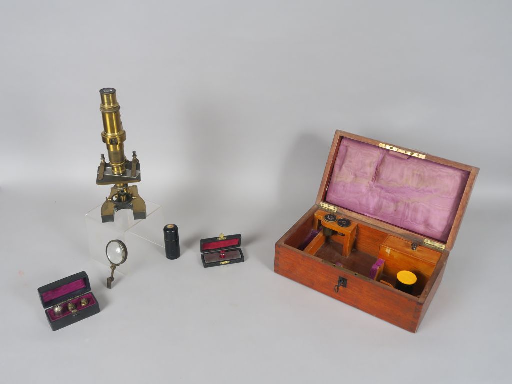 NACHET à Paris. Microscope en laiton et ses accessoires. Dans sa boite d'origine en acajou. H. 25,5 cm