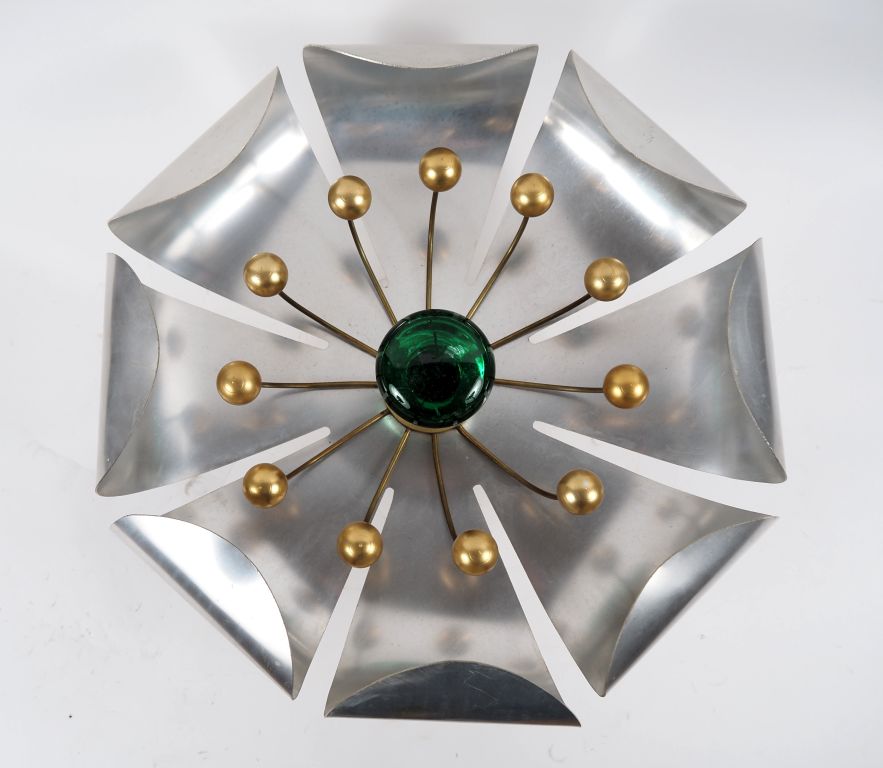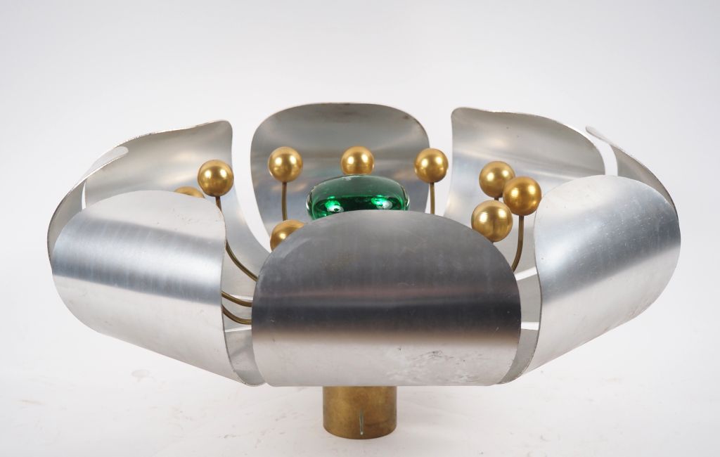 Plafonnier année 70 en métal chromé et doré figurant des pétales de fleurs. Diam. 50 cm.