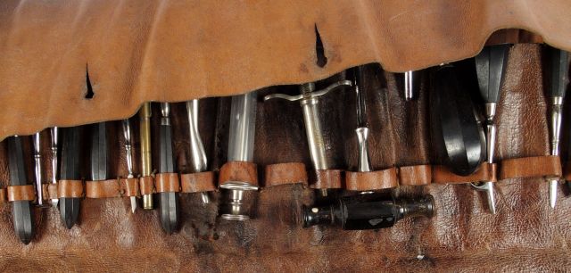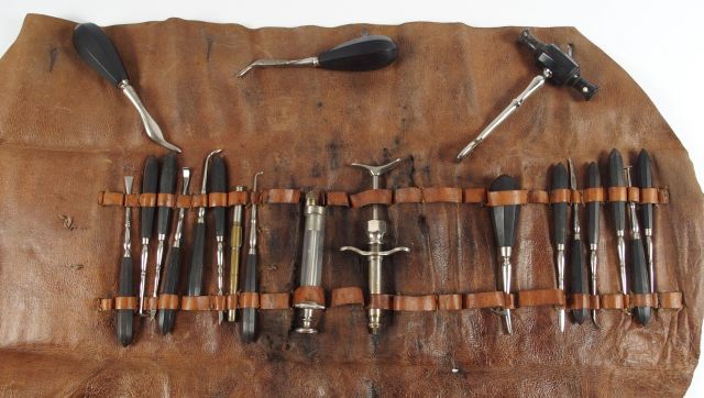 Trousse de chirurgien en cuir, manches des instruments en ébène.