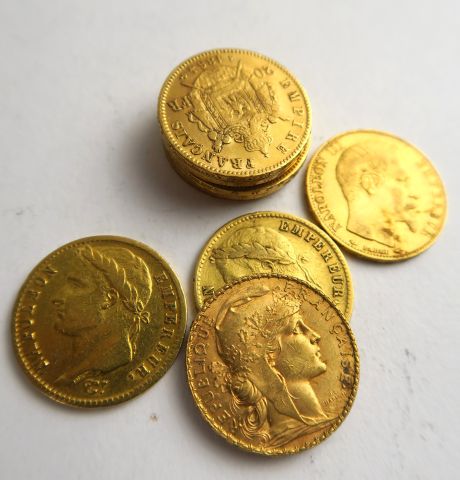 10 pièces 20 francs or (1811 A, 1812 A, 1854 A, 1858 A, 1859 A, 1861 A, 1863 B, 1864 A, 1868 A, 1910)