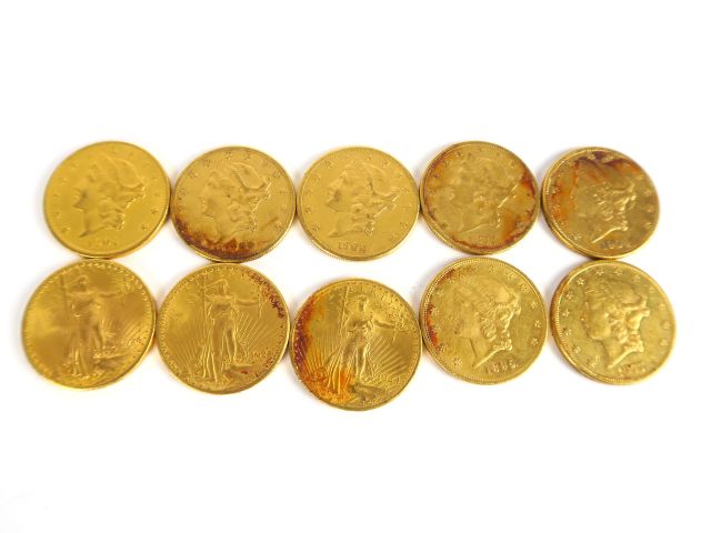 10 pièces de 20 dollars (1877 x 2, 1895, 1900 x 2, 1904 x 2, 1924 x 2, 1928). Frais acheteurs : 5 % HT