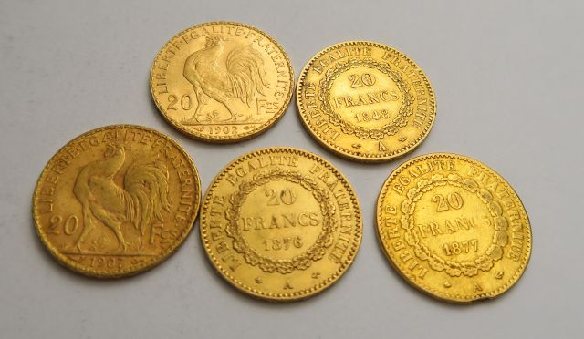 5 pièces de 20 francs or : 1848 A, 1876 A, 1877 A, 1902 et 1907. Frais acheteurs : 5 % HT