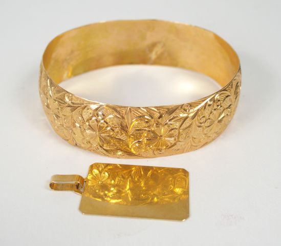Gourmette en or jaune gravée Pierre. Fermoir à cliquet et chaînette. P lot n°1 Estimation : 1 400 - 1 600 €