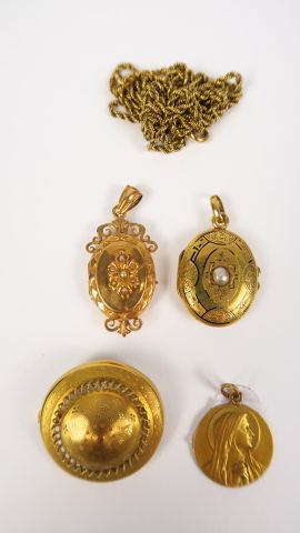 Chaine en or, broche Napoléon III en or, médaille en or, 2 pendentifs Napléon III en or. 27 g + 6 g tel