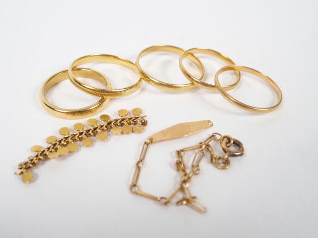 Cinq alliances en or jaune, gourmette d'enfant (accidentée) et un élément de bracelet en or jaune. Poids: 13,1gr