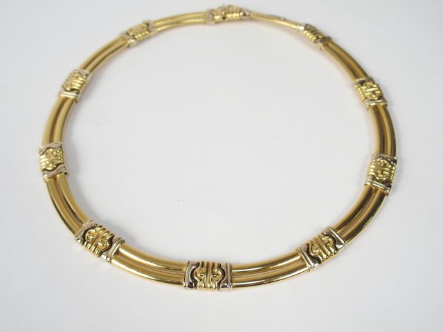 Lot de Collier articulé en or jaune et gris. 45 cm. Poids: 60gr au prix de 1000 à 1200 € en vente aux enchères par l'hôtel des ventes Primardeco