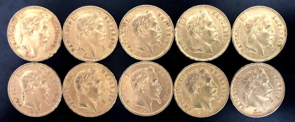 Dix pièces de 20 Francs or, 1861-A, 1863-A, 1864-BB, 1866-A, 1866-BB, 1867-BB, 1868-A, 1868-BB et 1869-BB (x2). FRAIS ACHETEURS 5% TTC.