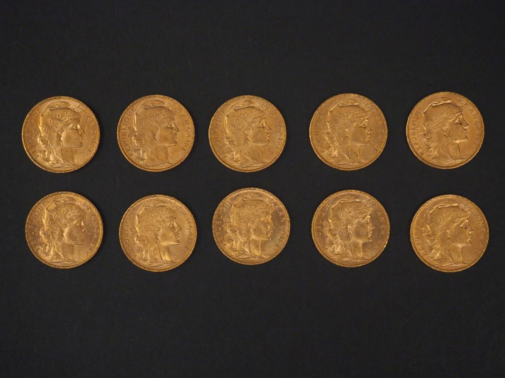 Lot de Dix pièces de 20 Francs or, 1907. FRAIS ACHETEURS 5% TTC. au prix de à € en vente aux enchères par l'hôtel des ventes Primardeco
