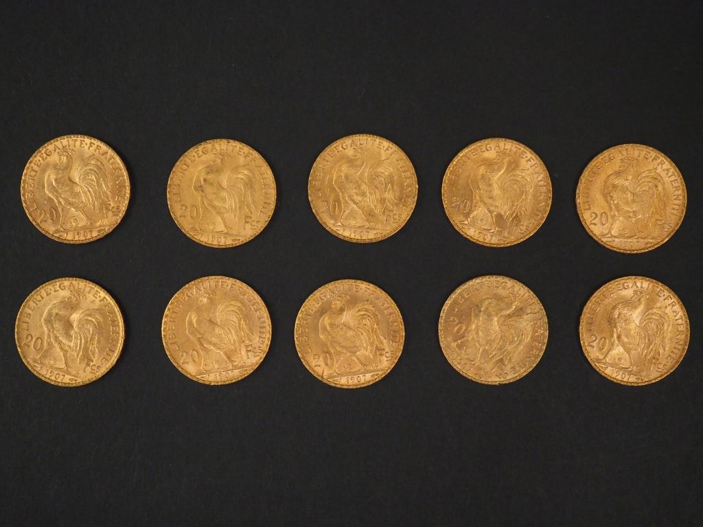 Dix pièces de 20 Francs or, 1907. FRAIS ACHETEURS 5% TTC.