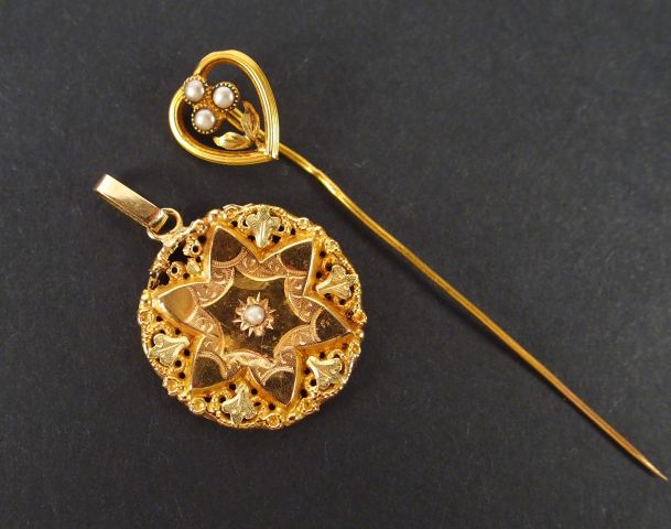 Epingle à chapeau en or jaune à décor de cœur et de fleur. On y joint un pendentif rond à décor d'étoile rehaussé d'une perle. Poids tel: 1,2gr
