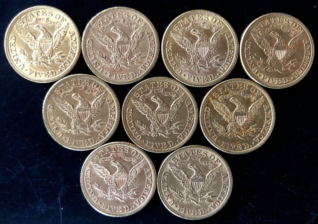 Neuf pièces de 5 Dollars or, 1882 (x2), 1884, 1892, 1897 (x2), 1899, 1903 et 1904. FRAIS ACHETEURS 5% TTC.
