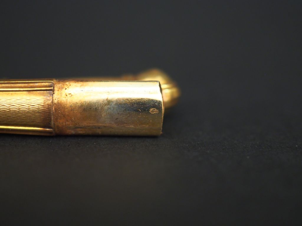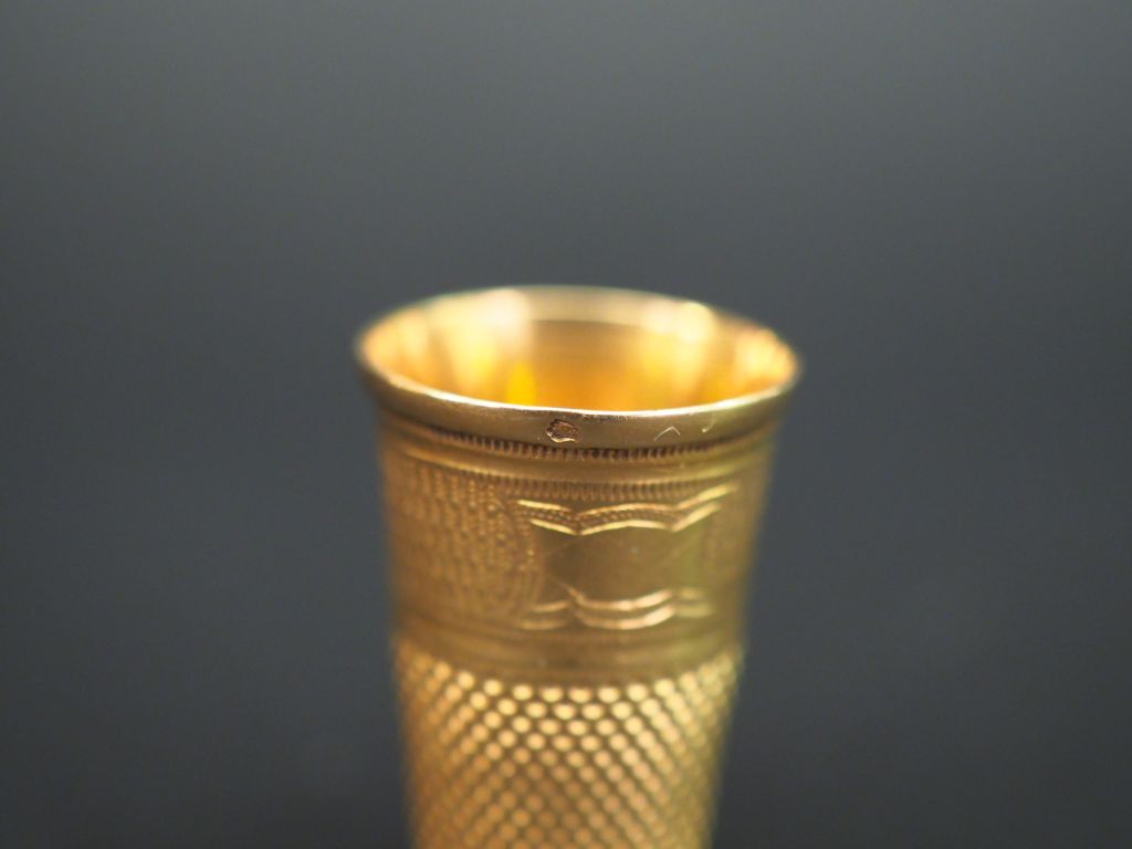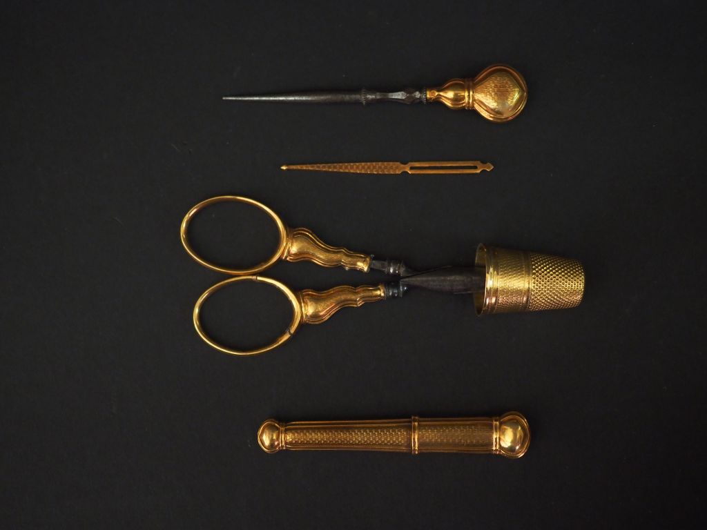Petit nécessaire à couture en or jaune. Comprenant : - un dé à coudre. Poids. 3,69 g - un étui à aiguille. Poids. 4,20 g - une aiguille passe-ruban. Poids. 1,23 g - une paire de ciseaux. Poids tel. 7,92 g - un poinçon. Poids tel. 4,54 g (petits accidents au ciseaux)