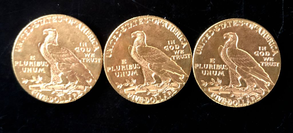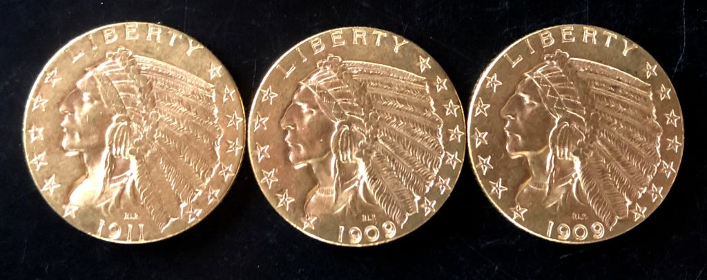 Trois pièces de 5 Dollars or, 1909 (x2) et 1911. FRAIS ACHETEURS 5% TTC.