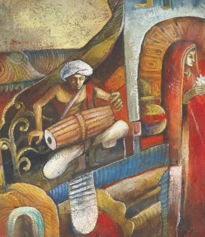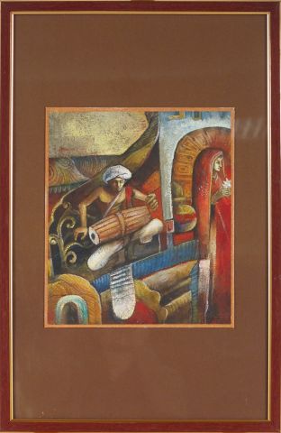 Ecole orientaliste "Musicien arabe et jeune femme". Pastel, signé en bas à droite. 30 x 26 cm
