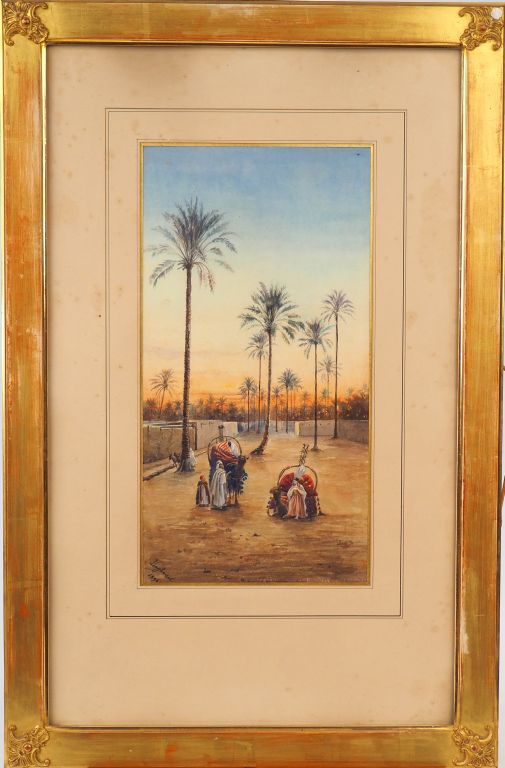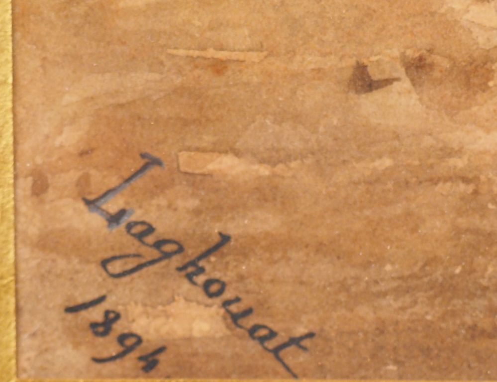LAGHOUAT. 'Chameliers au crépuscule' Aquarelle. Signée en bas à gauche et datée 1894. Dim. à vue : 38 x 19.5 cm.