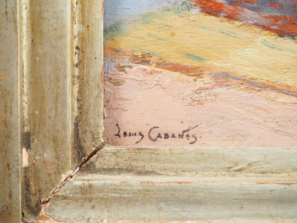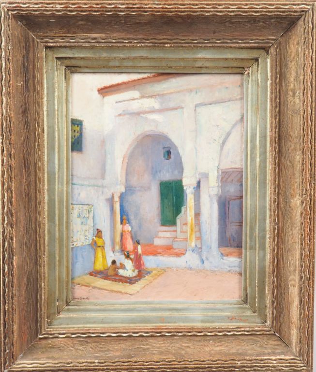 Louis CABANES. "Scène de vie dans un ryad". Huile sur panneau, signée en bas à gauche. Dim. : 40,5 x 30, 5 cm