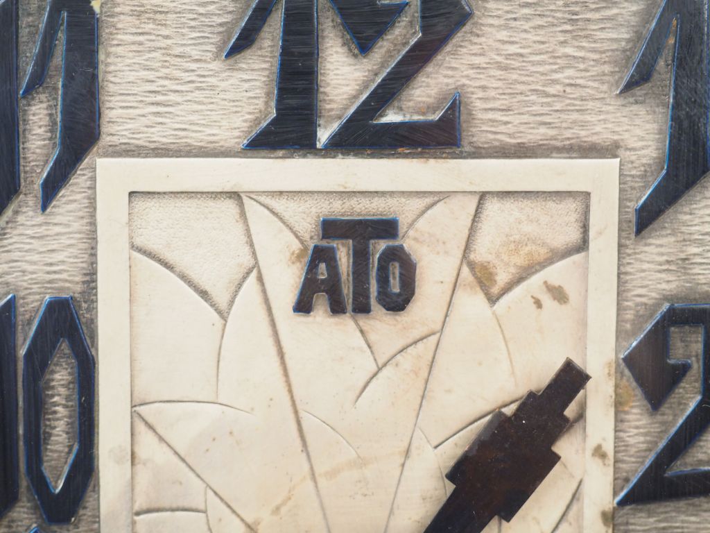 ATO. Pendule Art Déco en marbre bicolore portor et jaune de Sienne. Dim : 33,5 x 41 cm.