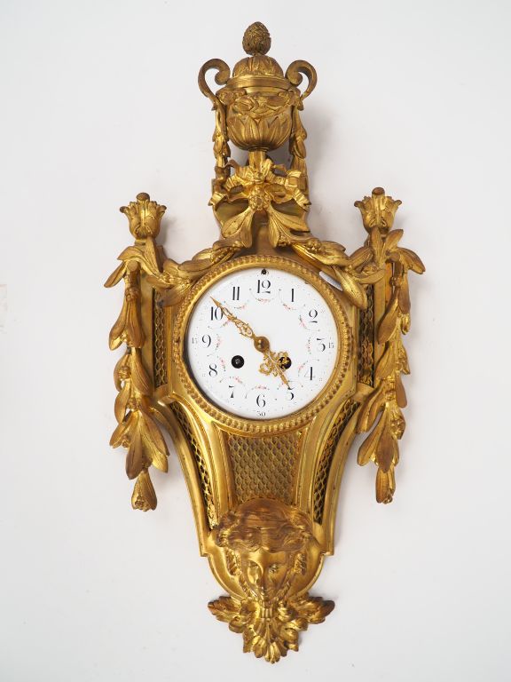 Cartel d'applique de style Louis XVI en bronze doré, à décor de vase à l'antique de guirlandes de feuillage et de mascarons, cadran émaillé. H. 60 cm
